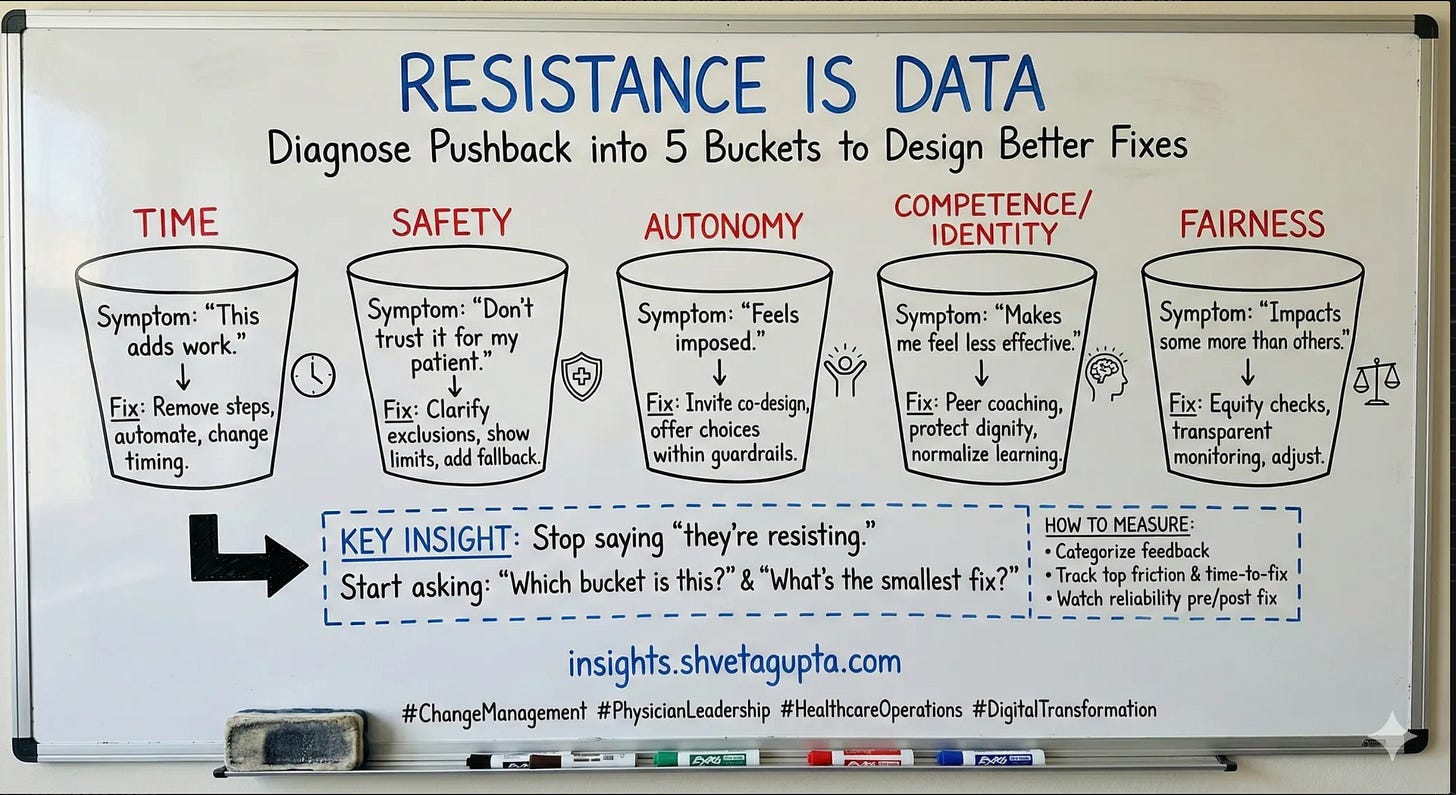 Happy Thursday. This week’s note focuses on the people side of transformation—how to interpret resistance and turn it into better design. You’ll get a simple diagnostic, a quick example, and one action to try this week.