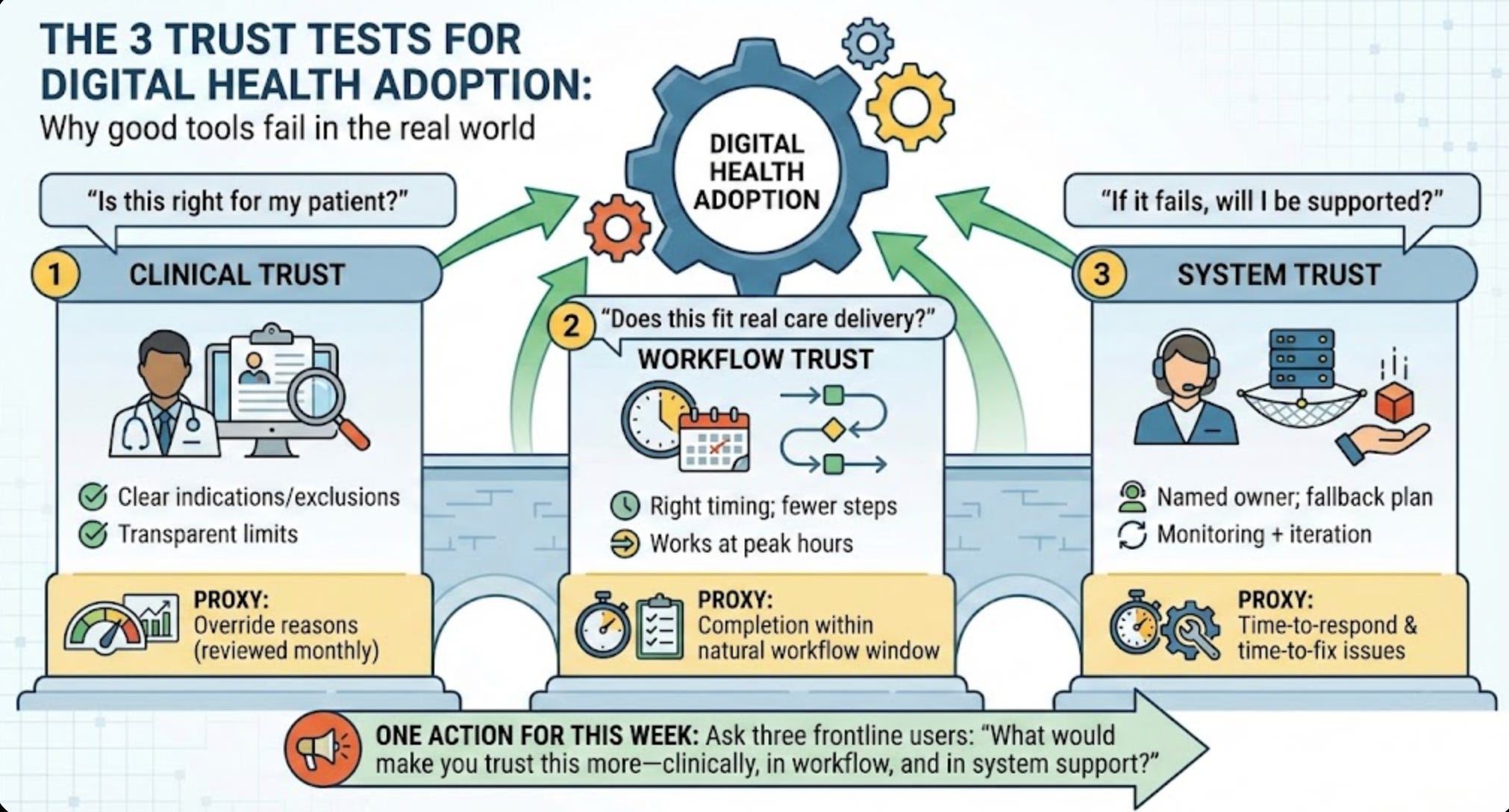 Adoption is usually a trust problem: clinical, workflow, and system trust. If any one is weak, adoption erodes.
